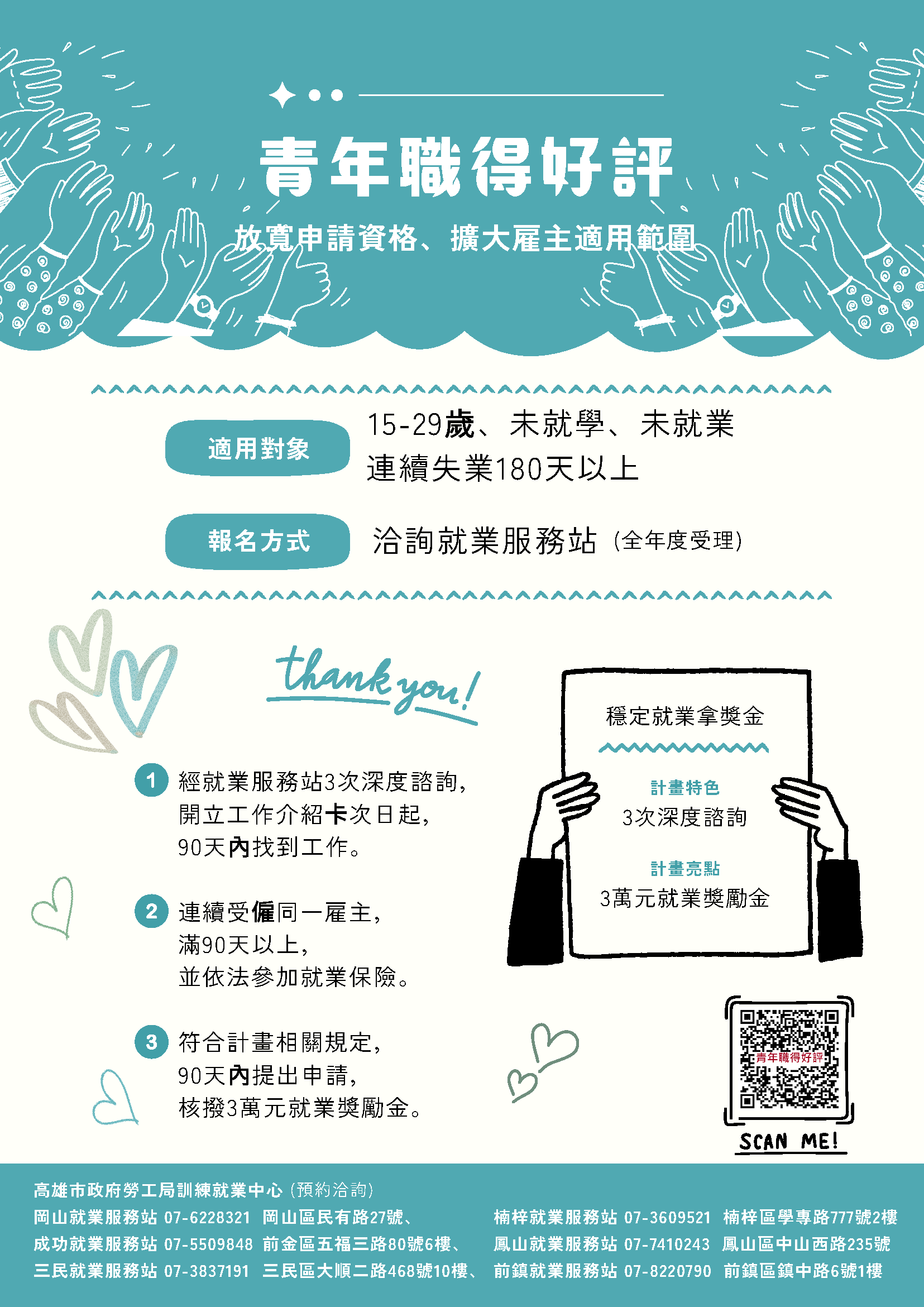 - 成功就業服務站:07-5509848,高雄市前金區五福三路80號6樓