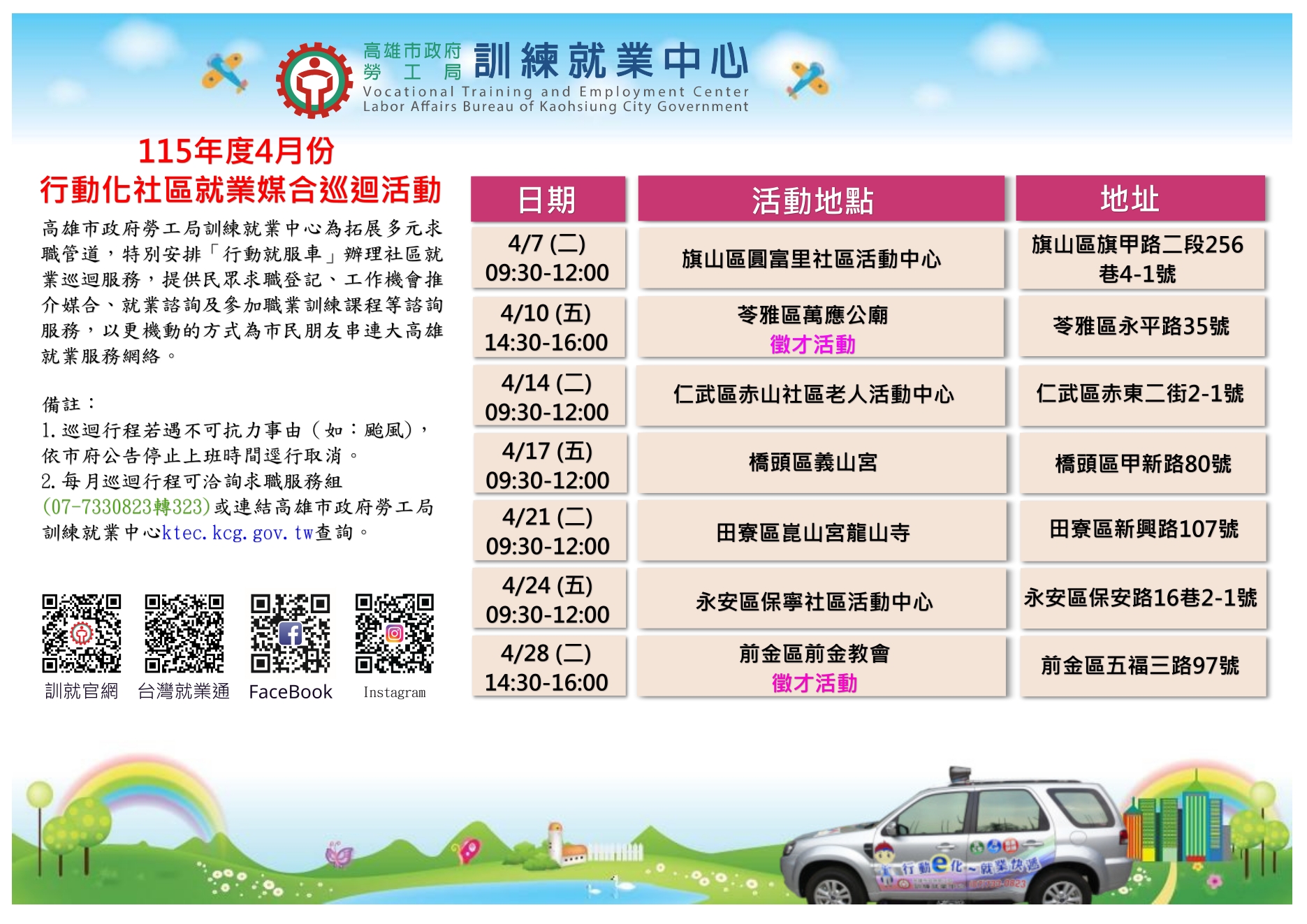 高雄市政府勞工局訓練就業中心為拓展多元求職管道,特別安排「行動就服車」辦理社區就業巡迴服務,提供民眾求職登記、工作機會推介媒合、就業諮詢及職業訓練課程、就業促進方案等諮詢服務,現場亦提供一般公司行號進行求才登記,以更機動的方式為市民朋友串連大高雄就業服務網絡,115年4月巡迴活動共7個行程,活動洽詢電話:07-7330823#323。