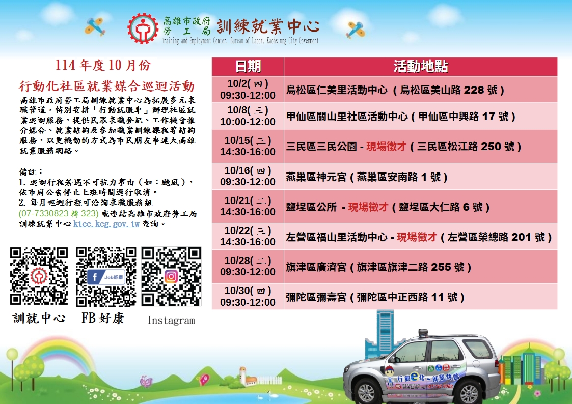 高雄市政府勞工局訓練就業中心為拓展多元求職管道,特別安排「行動就服車」辦理社區就業巡迴服務,提供民眾求職登記、工作機會推介媒合、就業諮詢及職業訓練課程、就業促進方案等諮詢服務,現場亦提供一般公司行號進行求才登記,以更機動的方式為市民朋友串連大高雄就業服務網絡,114年10月巡迴活動共8個行程,活動洽詢電話:07-7330823#323。